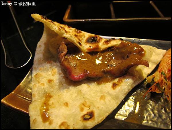 沒想到麵皮烤過之後彈性十足,夾上一塊肉配上咖哩醬味道也很香很濃呢