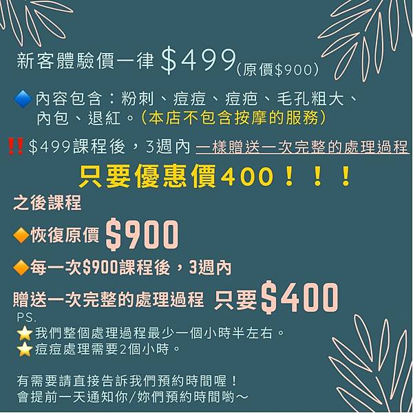 第一次的體驗價才只要499元,三周內還有一次400元的優惠價完整的處理